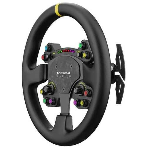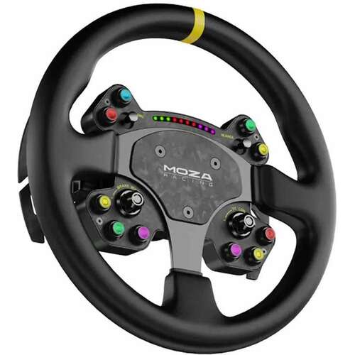 | Dodatno | Standardni prečnik 400 mm, četvorokraki dizajn – autentičan kamionski osećaj; Obod od perforirane mikrofiber kože sa ručnim šivenjem; 14 kratkohodnih RGB tastera (16,7M boja); 10 LED indikatora; 2 aluminijumska thumbwheel točkića + 2 ultra-tanka džojstika; Kompatibilan sa svim MOZA bazama; All-aluminum quick release sistem; Padele menjača od karbonskih vlakana, magnetne; Način povezivanja bežično ili žično (preko slip-ringa). |