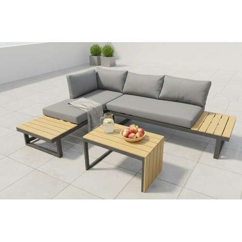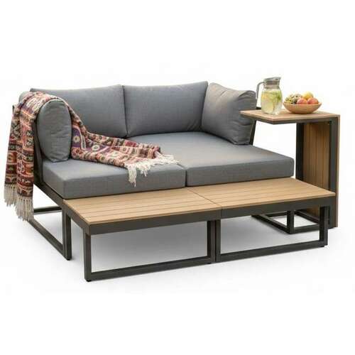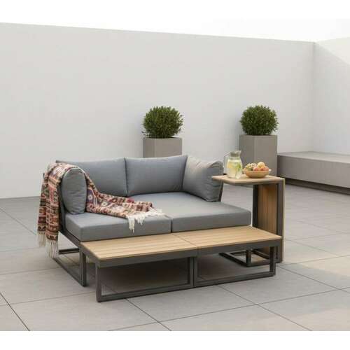 | Trosed dimenzija 165x72x64,7 cm i ugaona sofa 172x72x64,7 cm mogu se razdvojiti, rotirati i kombinovati u više konfiguracija, dok čajni sto 65x33,7x40,5 cm služi kao praktičan prateći element. Jastuci debljine 10 cm, izrađeni od 220 g spun poliestera, pružaju udobnost, a čelični ram sa praškastim premazom obezbeđuje stabilnost i dug vek trajanja. Ploča stola je od izdržljivog polywood materijala. | |